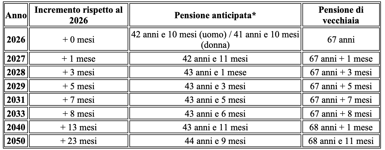 Secondo le stime della Ragioneria dello Stato, a legislazione vigente i requisiti per la pensione di vecchiaia e anticipata continueranno a crescere in modo costante, con l’età per la pensione che si avvicinerà ai 70 anni nel 2050.